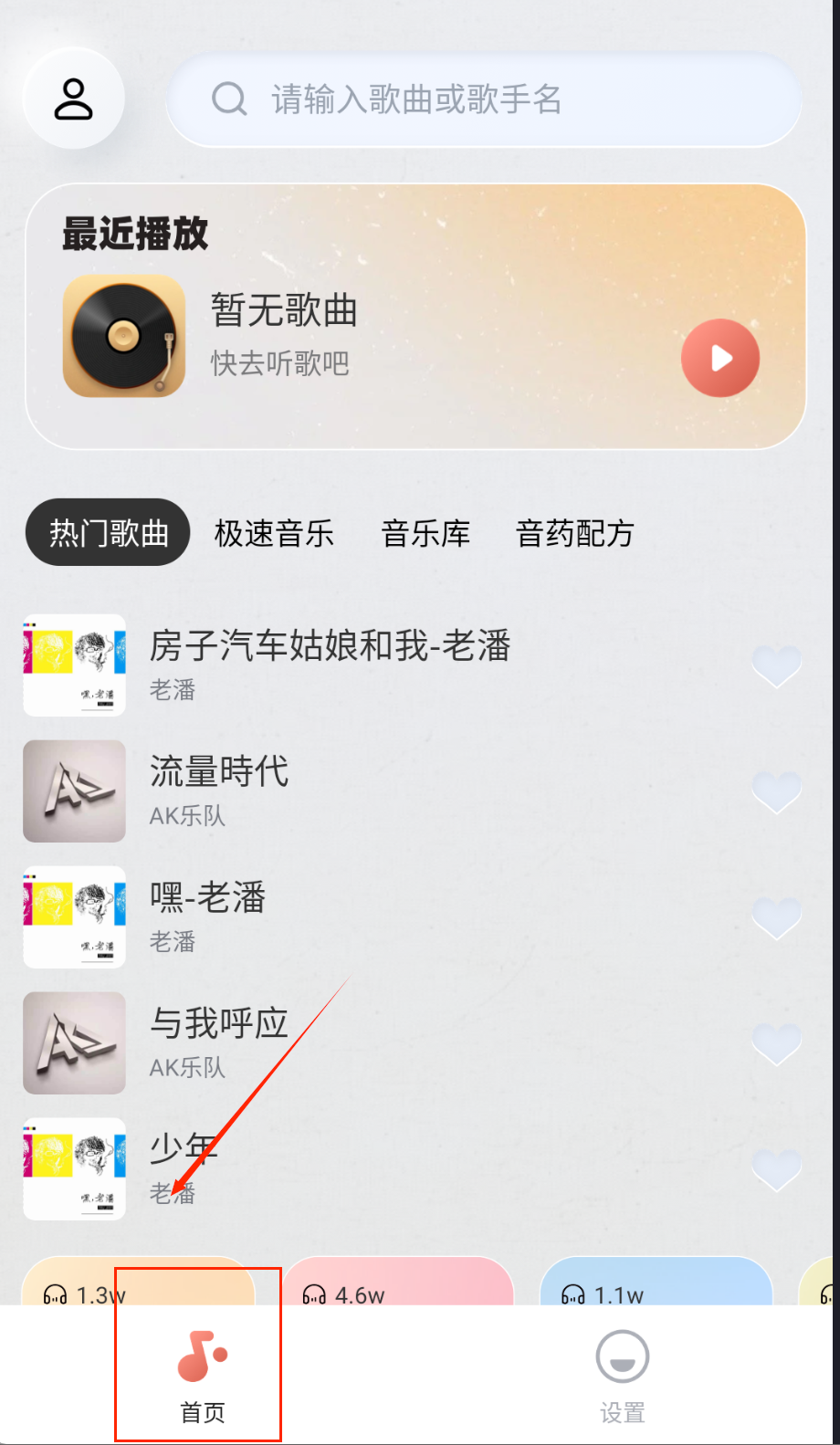 1、第一次使用时,你需要先在应用商店完成安装,打开应用后不用注册就能直接使用,系统会自动加载推荐的经典老歌歌单。整个准备环节简单又快捷。