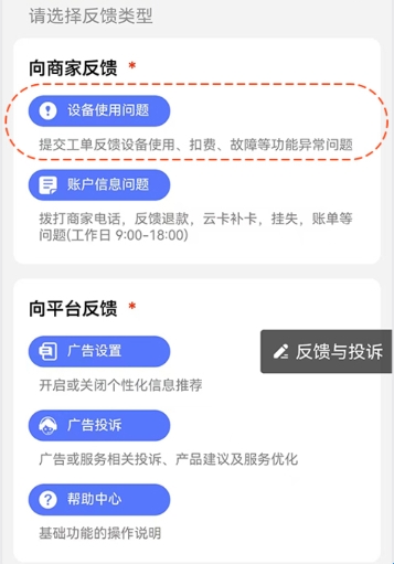 3、选择向商家反馈中的【设备使用问题】