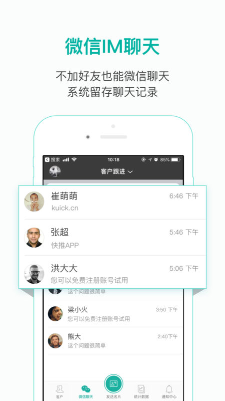 发送名片:点击“发送名片”按钮即可直接跳转至微信,快推会将销售的个人名片直接发送给意向客户或微信群。