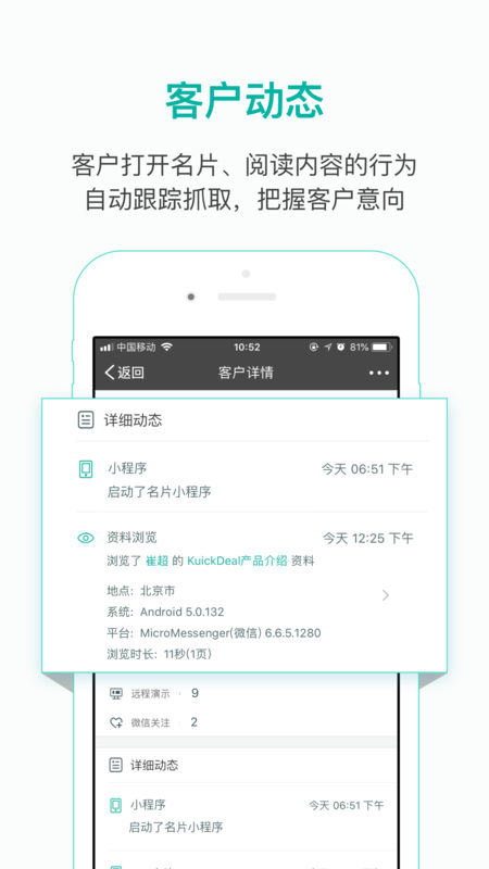 客户行为追踪:快推智能名片可对客户的名片浏览行为、浏览时长以及转发打开行为进行实时监测,并及时提醒销售人员。