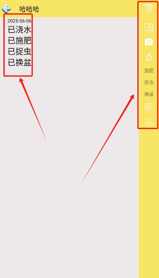 点击右侧的浇水、施肥、捉虫等按钮,即可快速记录植物的养护情况。