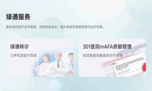 华为智能穿戴健康合作研发设备,通过高精准传感器实时采集患者健康数据,上传分析后同步至管理端后台,识别潜在健康风险,为恢复、复诊等阶段提供数据参考。