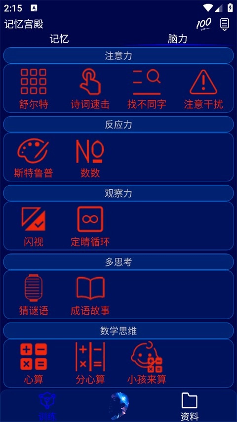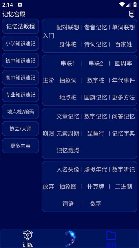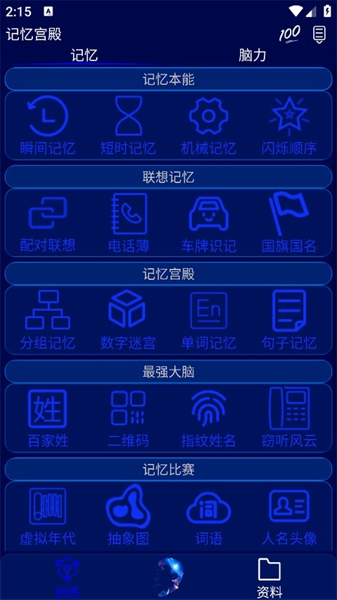 记忆训练涵盖了记忆本能、联想记忆、记忆宫殿、最强大脑、记忆比等内容。