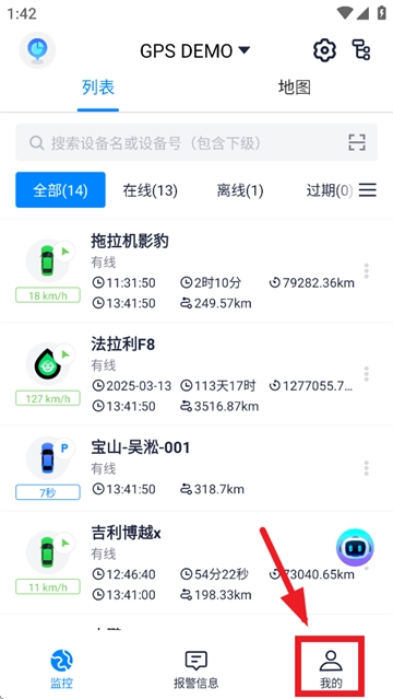 进入设备列表页面,查看每台设备的在线状态,并了解设备的轨迹信息。
