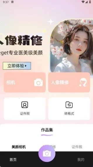 1.首页提供了相机、人像精修、证件照制作及格式转换等功能,用户也可在此浏览作品集。