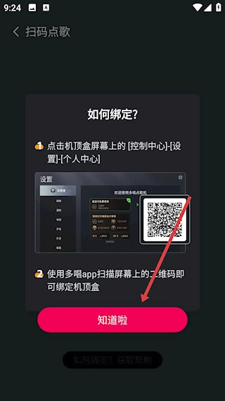 在扫码点歌页面,有清晰的绑定流程指引。具体操作是从机顶盒的控制中心进入设置,再找到个人中心里的二维码,扫描完成绑定后点击“我知道了”确认,若有需要也可选择获取帮助。