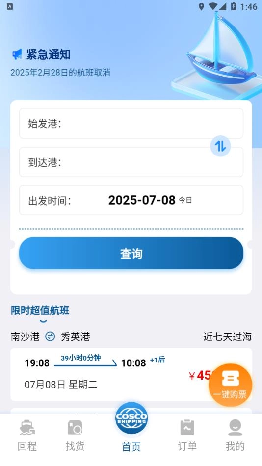 班次余票、开航时间、停售通知等数据实时更新,确保用户获取最新、最准确的航运信息。