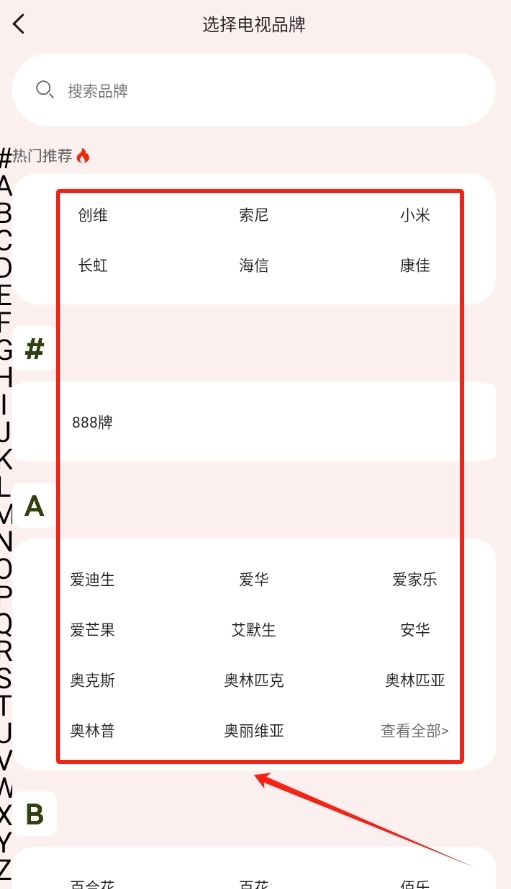 从这份品牌列表里,选出你家中电视对应的品牌,像海尔、创维这类都可以作为参考选项。