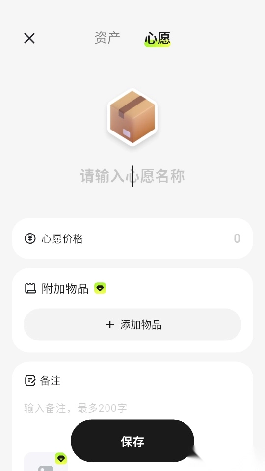 5、输入你的心愿名称并添加物品,点击“保存”按钮即可一键完成保存。