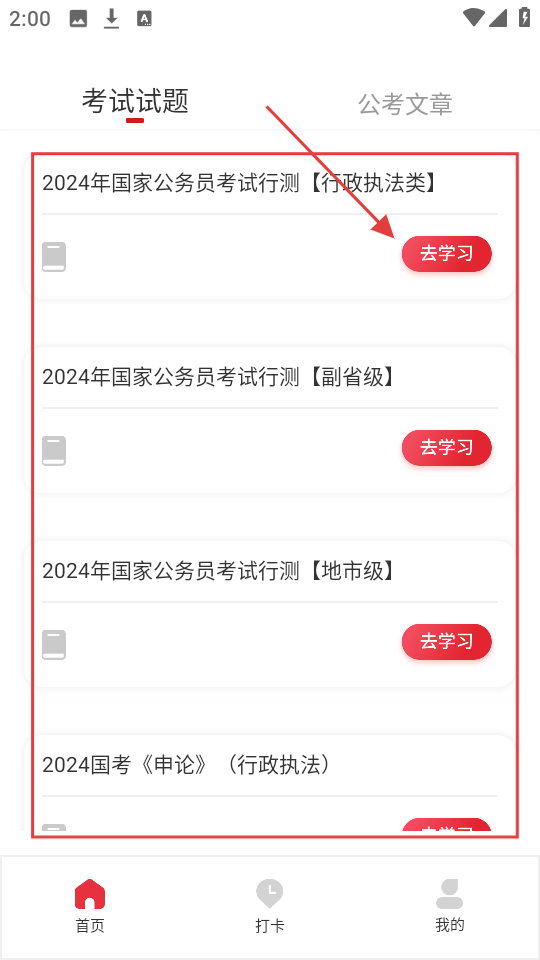 1、考试试题页面有不同类型的国考行测、申论试题,想学习就点对应的【去学习】。