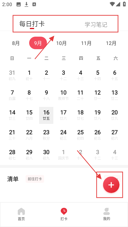 4、打卡页面有每日打卡和学习笔记,想打卡的话,点右下角【+】,就能进行打卡操作啦。