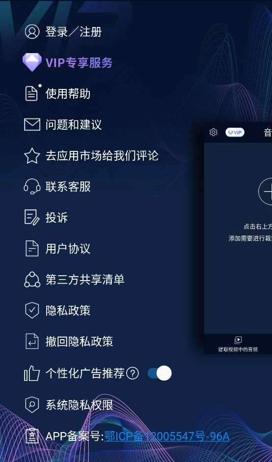 点击左上角的齿轮图标即可打开侧边栏,在这里可以进行登录操作、联系客服,还能查看用户协议与隐私政策,以及对个性化广告进行管理等设置。