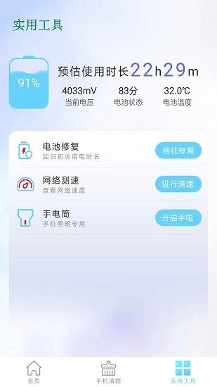 【大文件专清 实用工具】 那些占用手机空间的无用大文件,你可以按需选择删除!此外还有手电筒、电池修复功能,以及网络测试功能供你使用!