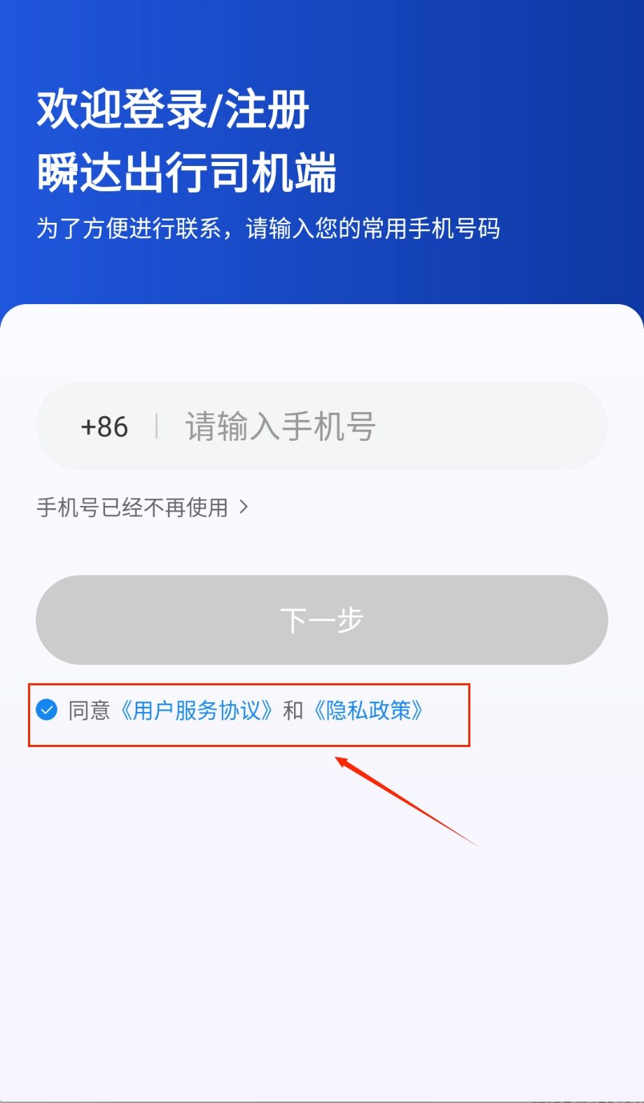 1、使用软件前,第一步是注册登录。打开瞬达出行司机端,在登录注册页面输入你常用的手机号码,注意要采用带+86的格式。