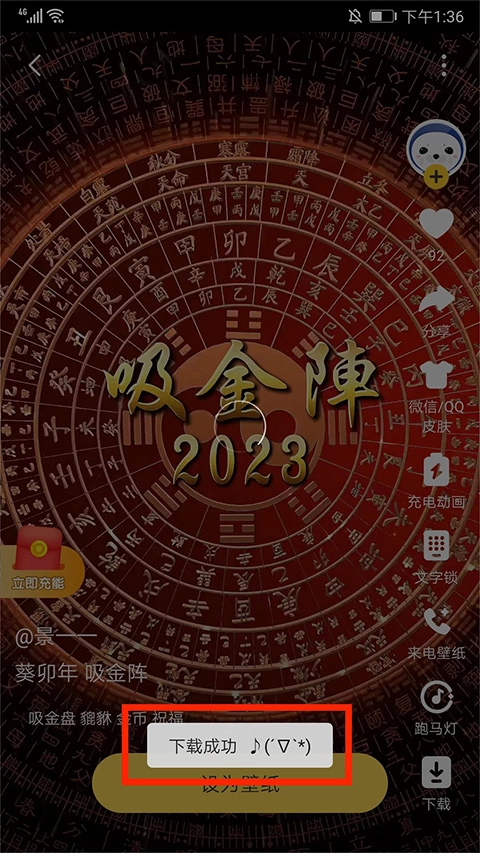 进入对应的壁纸界面后,能把壁纸设置成【微信/QQ皮肤】、【充电动画】、【文字锁】、【来电壁纸】、【跑马灯】这些类型,用户可以按照自己的需求挑选使用,这里我们选择界面下方的【设为壁纸】选项。