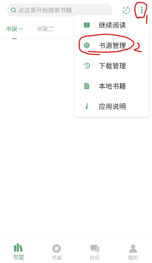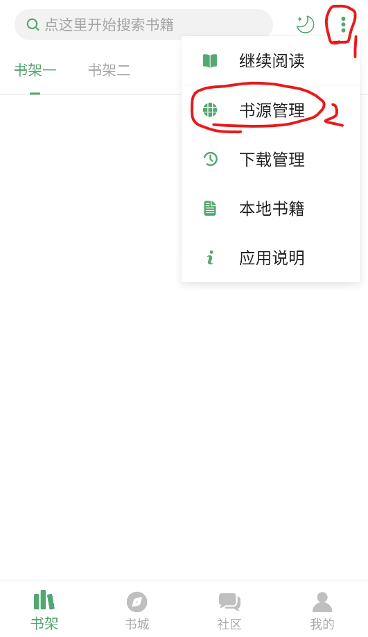 打开乾坤听书,在书架页面,点击右上角的三竖点图标,接着点击书源管理选项。