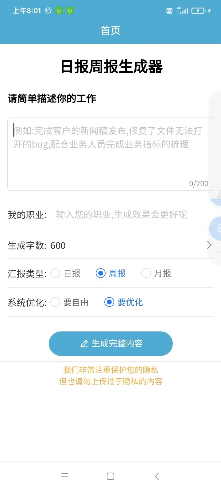 日报周报生成器,是一款专为职场人士打造的高效报告工具。该通过简洁的界面与强大的功能,帮助用户快速生成日报、周报等各类工作总结,极大地提升了工作效率。无论是项目进展、工作成果,还是问题反馈,都能通过这款轻松呈现,让工作汇报变得简单又高效。