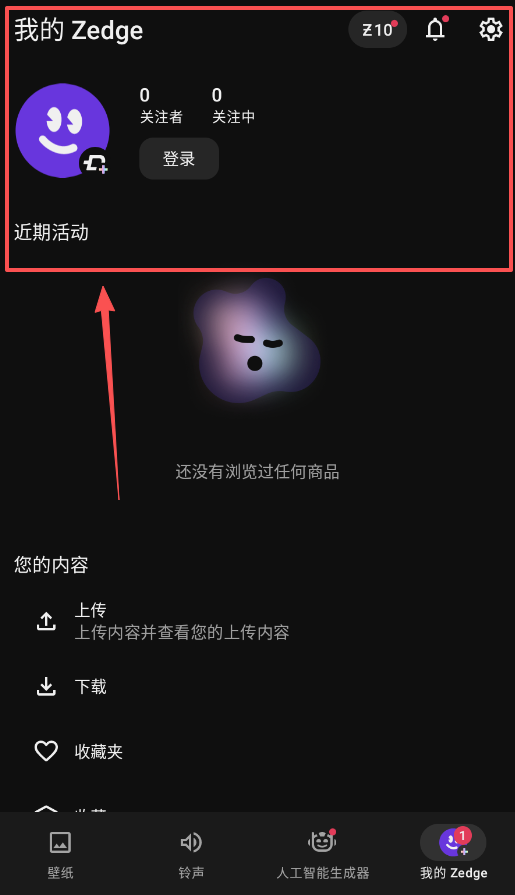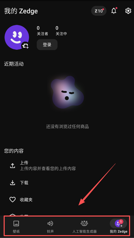 3、若要管理已获取的内容,需进入“我的Zedge”页面。该页面会展示你的关注者数量及近期活动,你可以先前往其他版块进行探索。