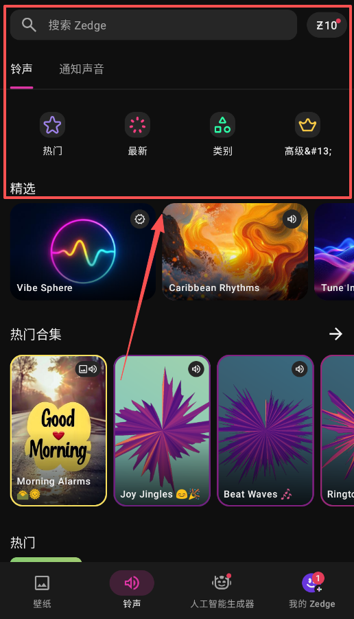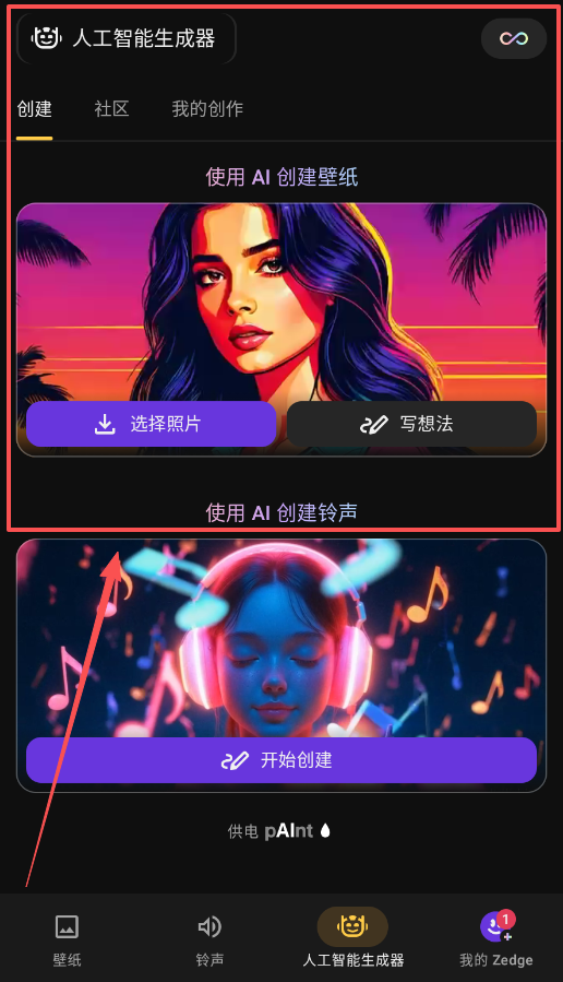 1、第一步是打开Zedge应用,此时在底部的导航栏里,能看到“壁纸”“铃声”“人工智能生成器”以及“我的Zedge”这四个主要的功能版块。