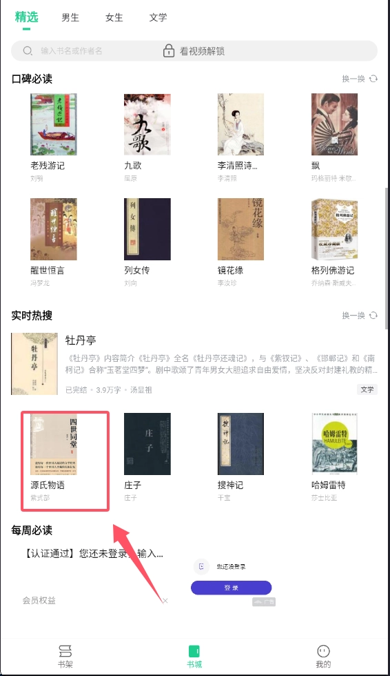 1、打开软件后,首先会看到底部有书架、书城和我的三个导航按钮。点击书城进入主界面,上方有精选、男生、女生、文学等分类标签。
