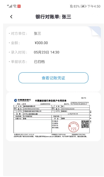 3、选择对应的记录后,能够查看单位、金额、录入时间、单据状态以及记账凭证等详细信息。