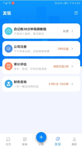 6、进入发现界面后,还能看到视频教程、公司注册、审计评估、财务咨询等功能选项。