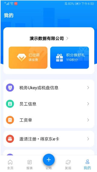 7、进入“我的”界面,可查看税务Ukey或税盘信息、员工信息、工资单等内容。
