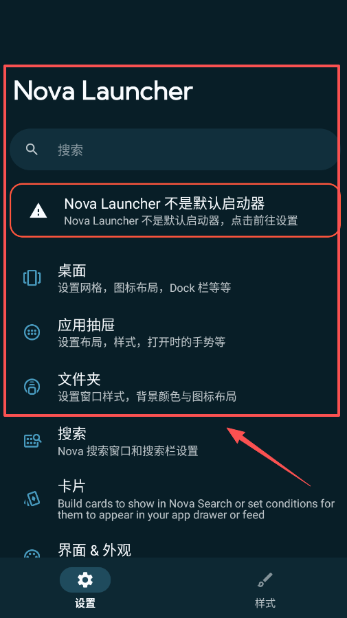 1、首要步骤是设置默认启动器,当出现“Nova Launcher 不是默认启动器”的提示时,点击它并跟随指引进入系统设置页面。