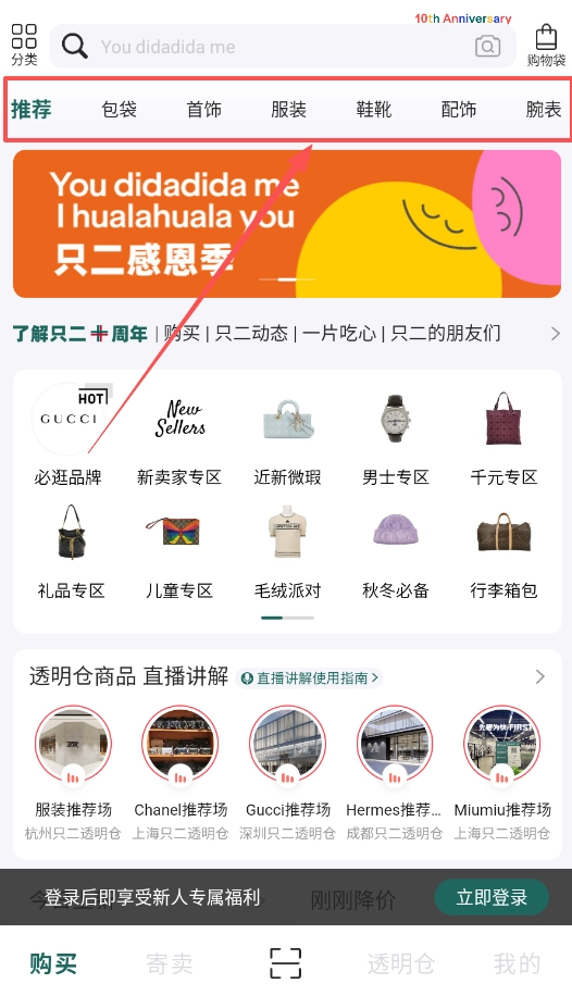 2、要是有购物需求,可以浏览首页的必逛品牌区,这里划分了男士专区、千元专区等板块,底部可以随时切换购买、寄卖、透明仓等页面。