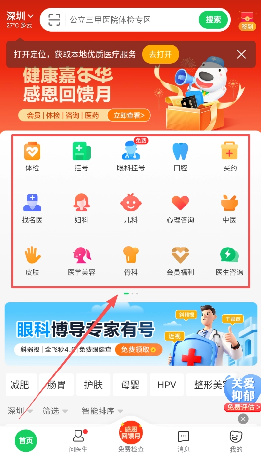 2、登录成功后进入首页,通过顶部的搜索框或下方的分类入口如体检、挂号、买药等,快速找到你需要的医疗服务。