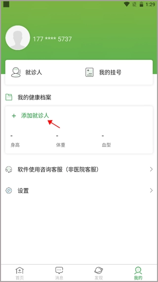 1、打开登录软件账号后,切换到“我的”功能模块,选择“我的健康档案”里的添加就诊人。