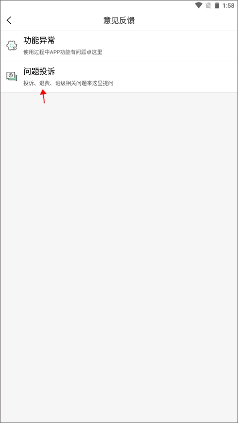 2、反馈类型分为两种:功能异常和问题投诉。其中问题投诉涵盖了投诉、退费、班级等相关问题,接下来我们选择点击问题投诉这一选项。