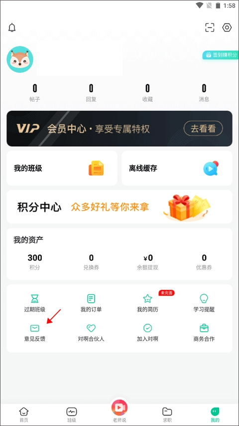 1、先打开软件并登录自己的账号,接着切换到“我的”界面,然后在该界面下方的功能选项里找到并点击“意见反馈”,通过这个入口联系在线客服。