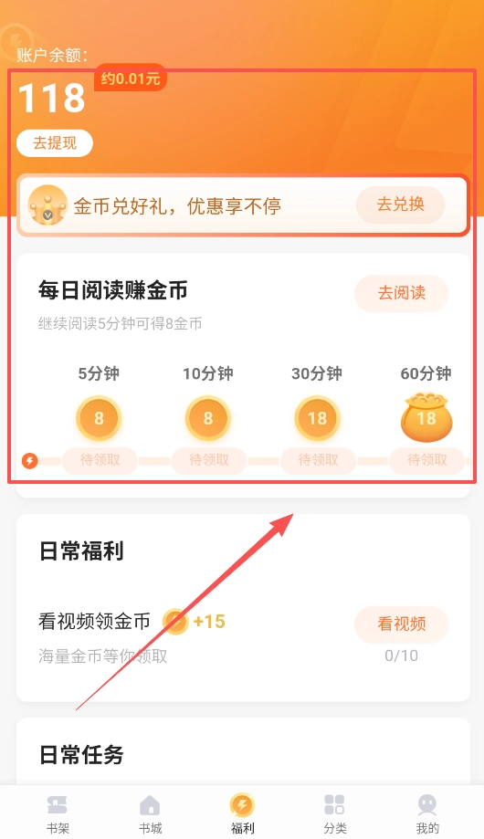 3、另外,要是想获取金币,大家可以多留意“福利”板块,那里有“每日阅读赚金币”的任务,能帮你增加账户余额哦。