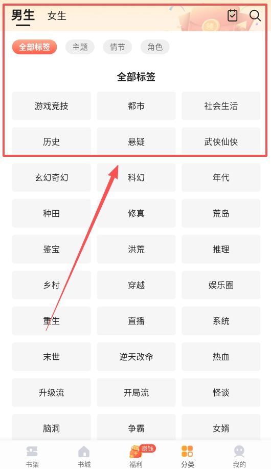 2、接下来,你可以借助种类丰富的标签来精准筛选书籍,标签的类型十分多样,合理运用这些分类能够帮助你更快速地找到符合自己阅读喜好的小说。