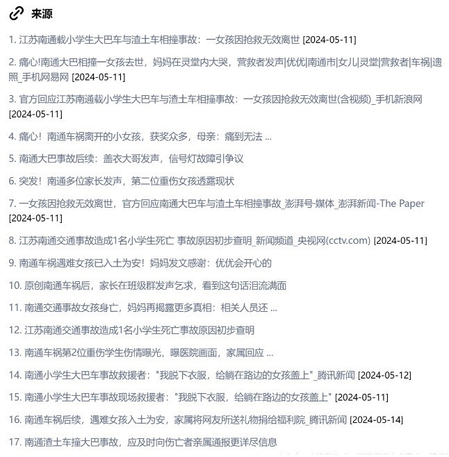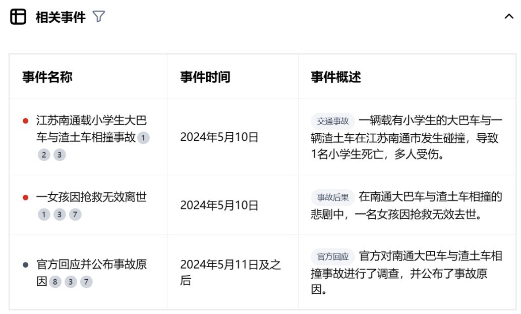 除了提供事件概述与脑图,秘塔AI搜索还会自动梳理相关事件,让用户从事件名称、事件时间及事件概述这三方面,了解事情的发展过程。