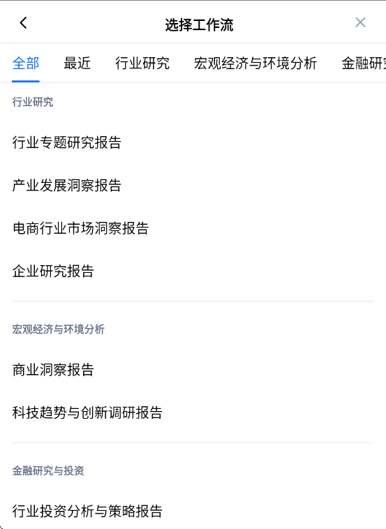行业调研以及报告撰写这类工作,都能交付给AI来完成。秘塔AI搜索具备7大类、25个细分场景的工作流,其覆盖范围涉及行业研究、经济分析、金融投资、运营方案等各式各样的场景。