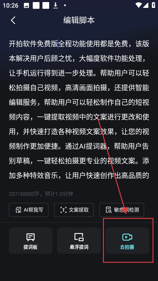 3、脚本编辑完成后,点击【去拍摄】按钮,即可进入拍摄页面使用提词器功能。