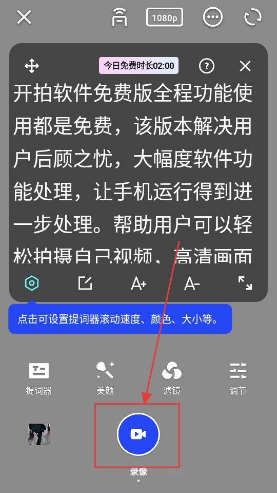 4、进入拍摄界面后,点击【录像】按钮,就能启动拍摄并同时使用提词器功能啦。