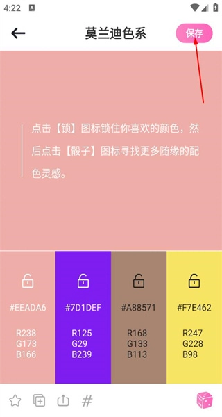 4、更换到满意的配色组合后,点击右上角保存按钮,即可留存这组莫兰迪色系配色方案。