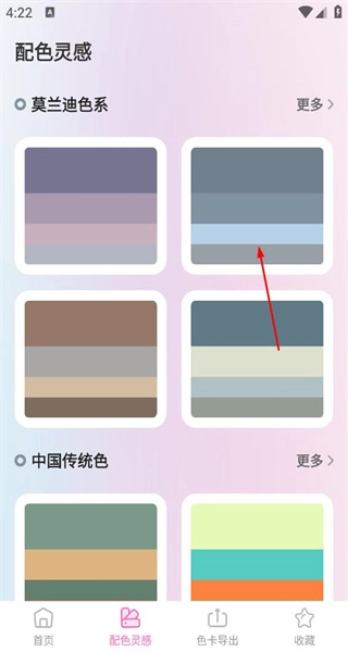 2、进入配色灵感页,选择莫兰迪色系分类,点击其中一组配色进入该色系的详情界面。