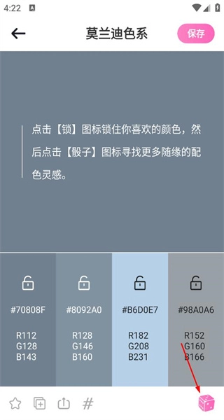 3、进入莫兰迪色系详情页,查看配色对应的色号信息,点击底部骰子按钮更换配色组合。