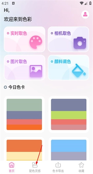 1、打开色彩,进入首页,看到实时取色等功能,点击底部配色灵感选项进入对应页面。