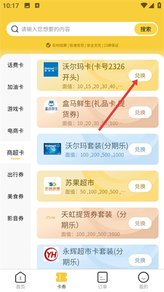 2、在卡券界面找到【沃尔玛卡(卡号2326开头)】,点击其对应的【兑换】按钮,进入该卡券的回收流程。