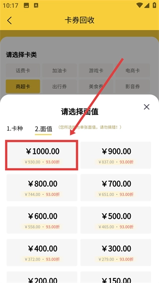 3、在卡券回收的面值选择界面,选定【¥1000.00】的面额选项,完成回收面值的确认操作。