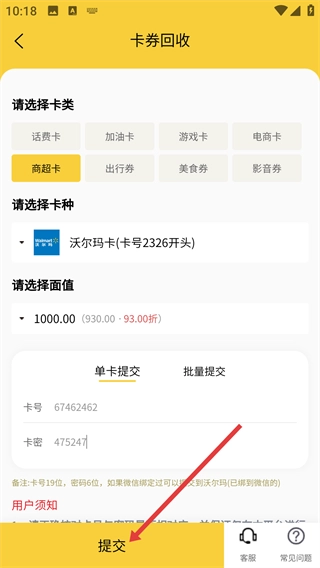 4、在卡券回收界面填写对应【卡号】【卡密】信息,确认无误后点击【提交】按钮,完成卡券回收的提交。