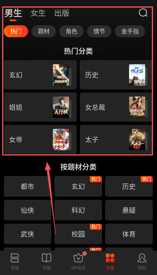 2、找书时,你可以通过顶部的精选、男生、女生、出版标签筛选内容,等特色标签来精准定位感兴趣的小说呢。