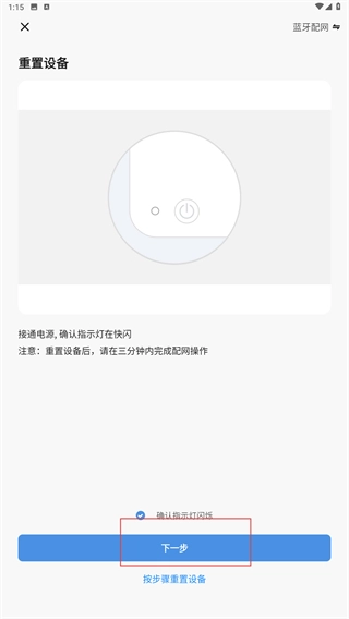 4、进入重置设备页面后,先接通设备电源,待确认指示灯处于快闪状态,勾选“确认指示灯闪烁”选项,随后点击【下一步】按钮,继续推进设备配网流程的完成。