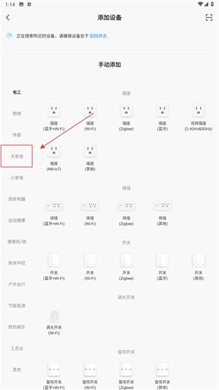 进入添加设备页面后,系统会自动搜索附近处于配网状态的设备;若需手动操作,也能通过左侧的“大家电”等分类来选择设备类型。
