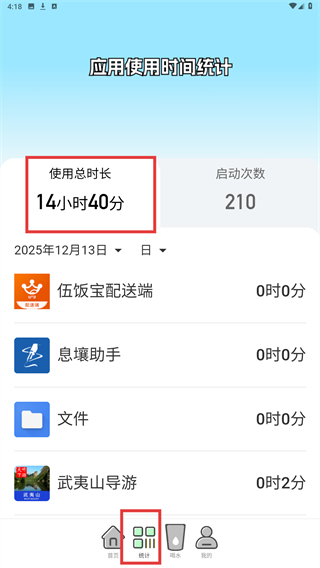 3、切换到应用统计页面,可查看【使用总时长】【启动次数】等数据,了解各应用的使用情况。